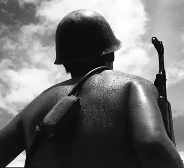 他以赤膊士兵背上的汗珠作為照片聚焦點(diǎn),鋼盔與步槍交代了人物身份