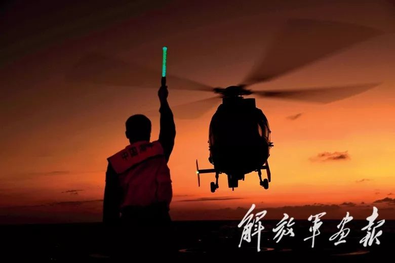 下圖為一張艦載直升機(jī)跨晝夜著艦訓(xùn)練的照片
