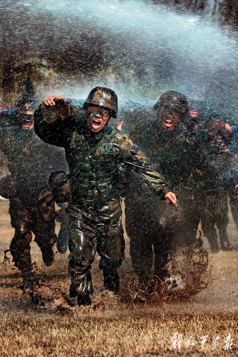 下圖,攝影師采用高速快門來(lái)抓拍士兵臉上怒吼的表情,利用右側(cè)噴射的水花,腳下濺起的泥水來(lái)襯托士兵勇猛向前的氣勢(shì)。