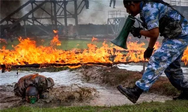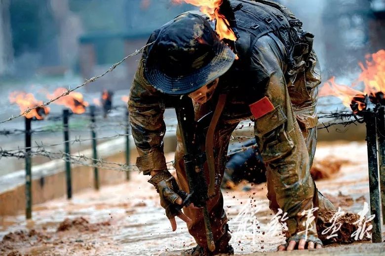 背景的烈火,污濁的泥潭,嚴(yán)厲的教官,左下角的士兵以最標(biāo)準(zhǔn)的匍匐姿態(tài)完成每一個(gè)訓(xùn)練動(dòng)作,體現(xiàn)部隊(duì)訓(xùn)練的嚴(yán)格性。