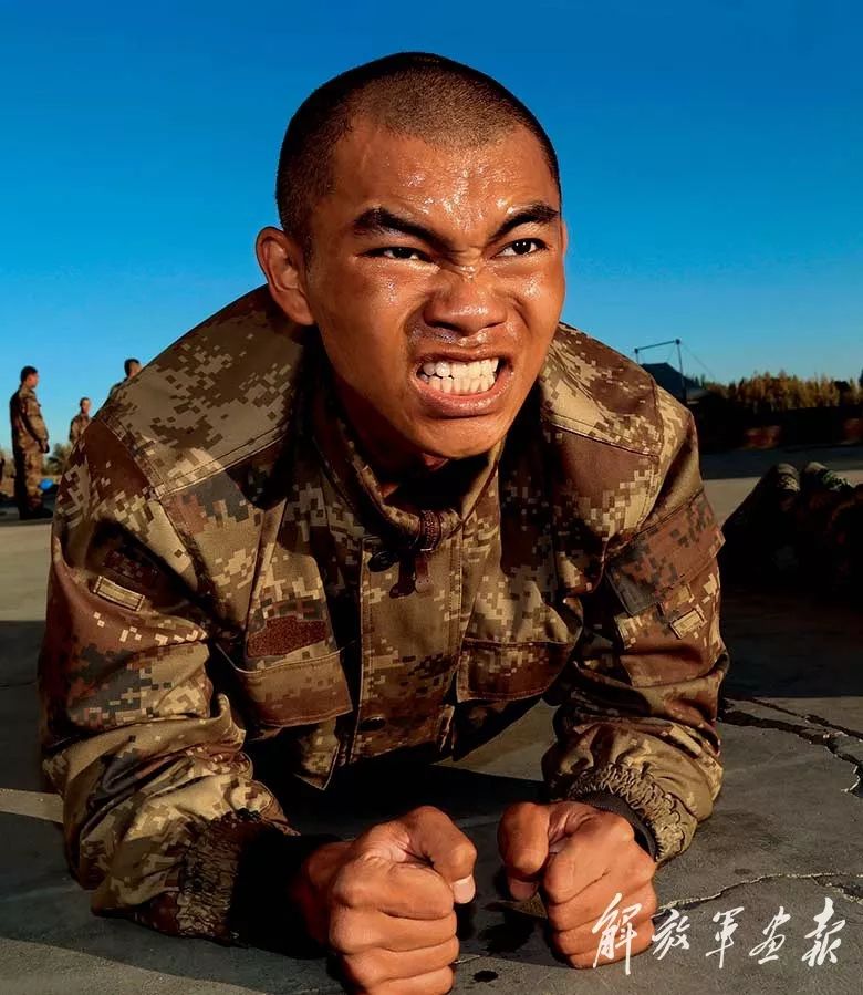 新兵臉上的汗水以及豐富的面部表情讓這張人物特寫(xiě)照片看起來(lái)特別生動(dòng)