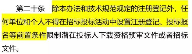 其實(shí),在此之前,國家發(fā)改委和住建部等八部委公布的第20號令《電子招標(biāo)投標(biāo)辦法》中,就明確規(guī)定:除本辦法和技術(shù)規(guī)范規(guī)定的注冊登記外,任何單位和個人不得在招標(biāo)投標(biāo)活動中設(shè)置注冊登記、投標(biāo)報名等前置條件,限制潛在投標(biāo)人下載資格預(yù)審文件或者招標(biāo)文件。